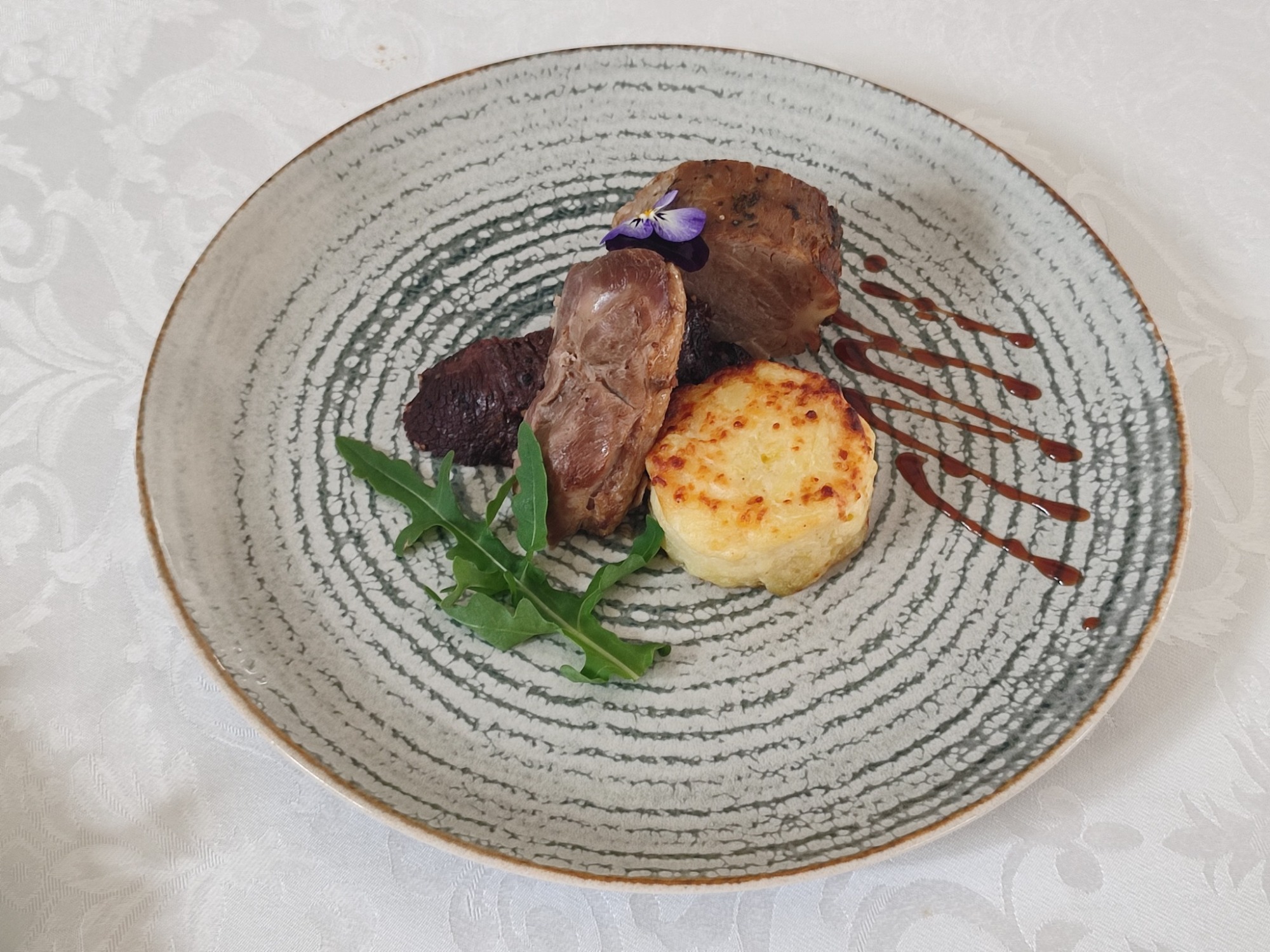 (Piept de pui, sos de rodie, piure de cartofi, pesto) -